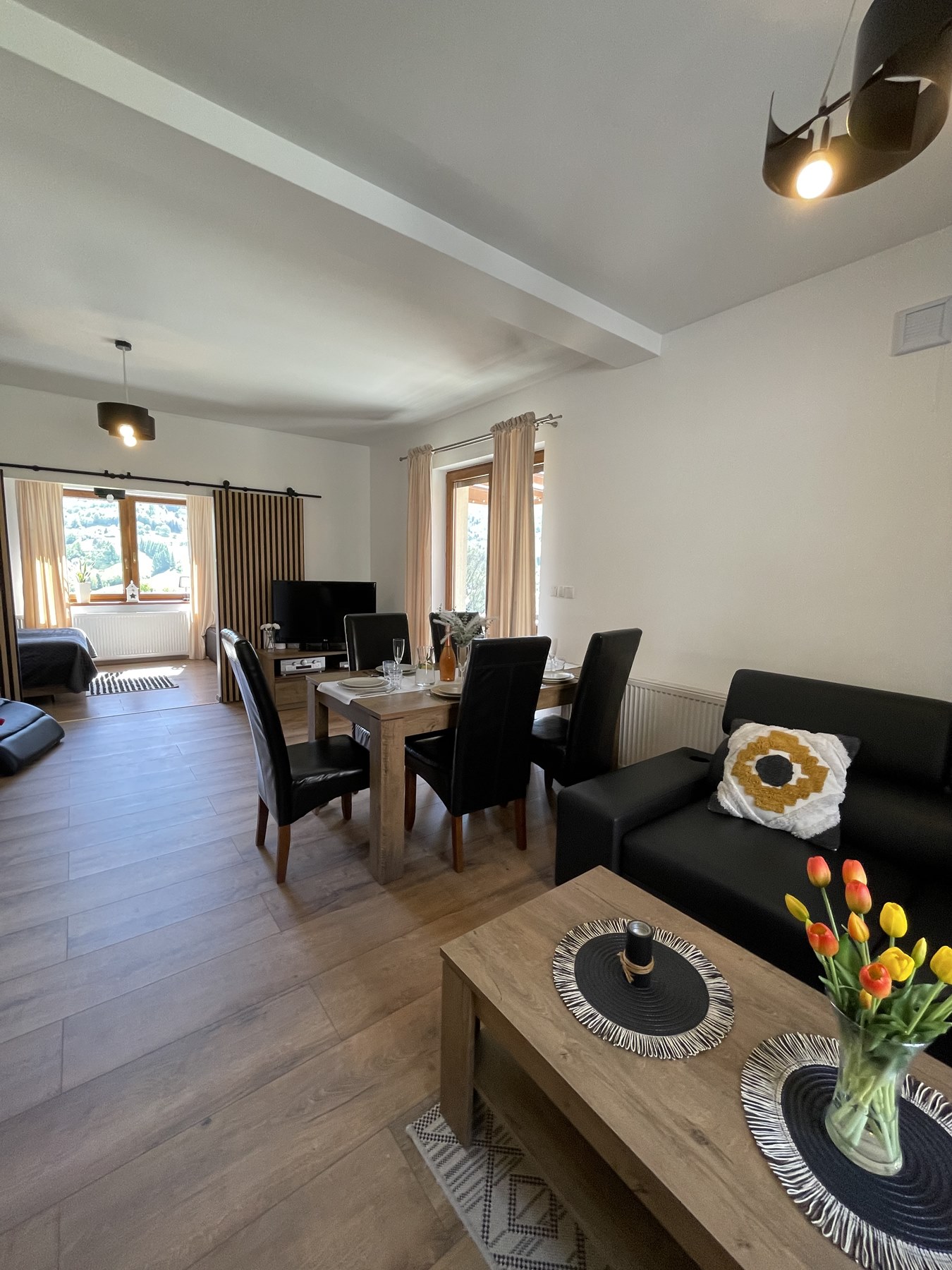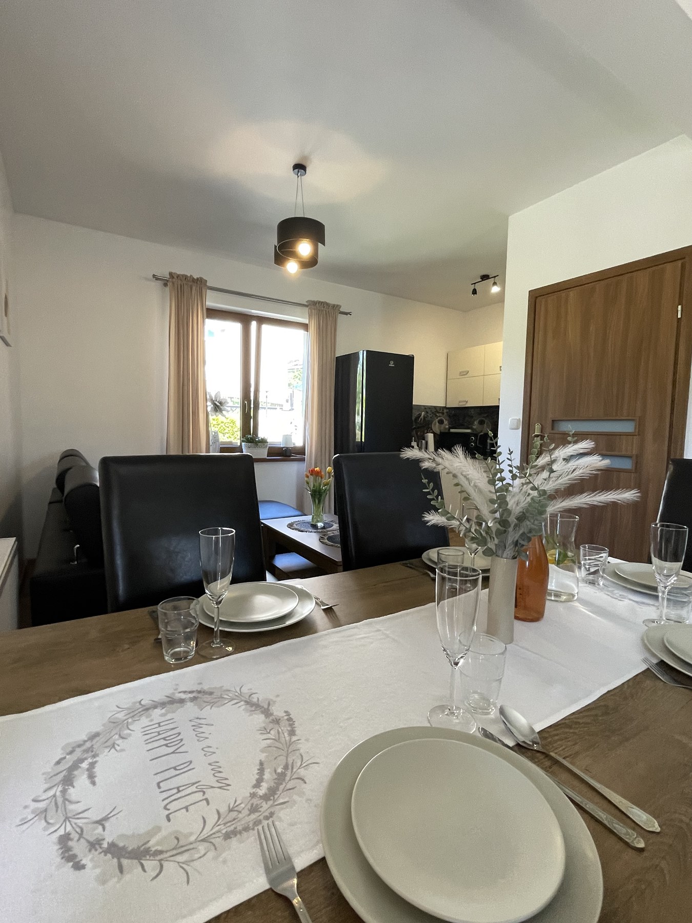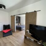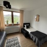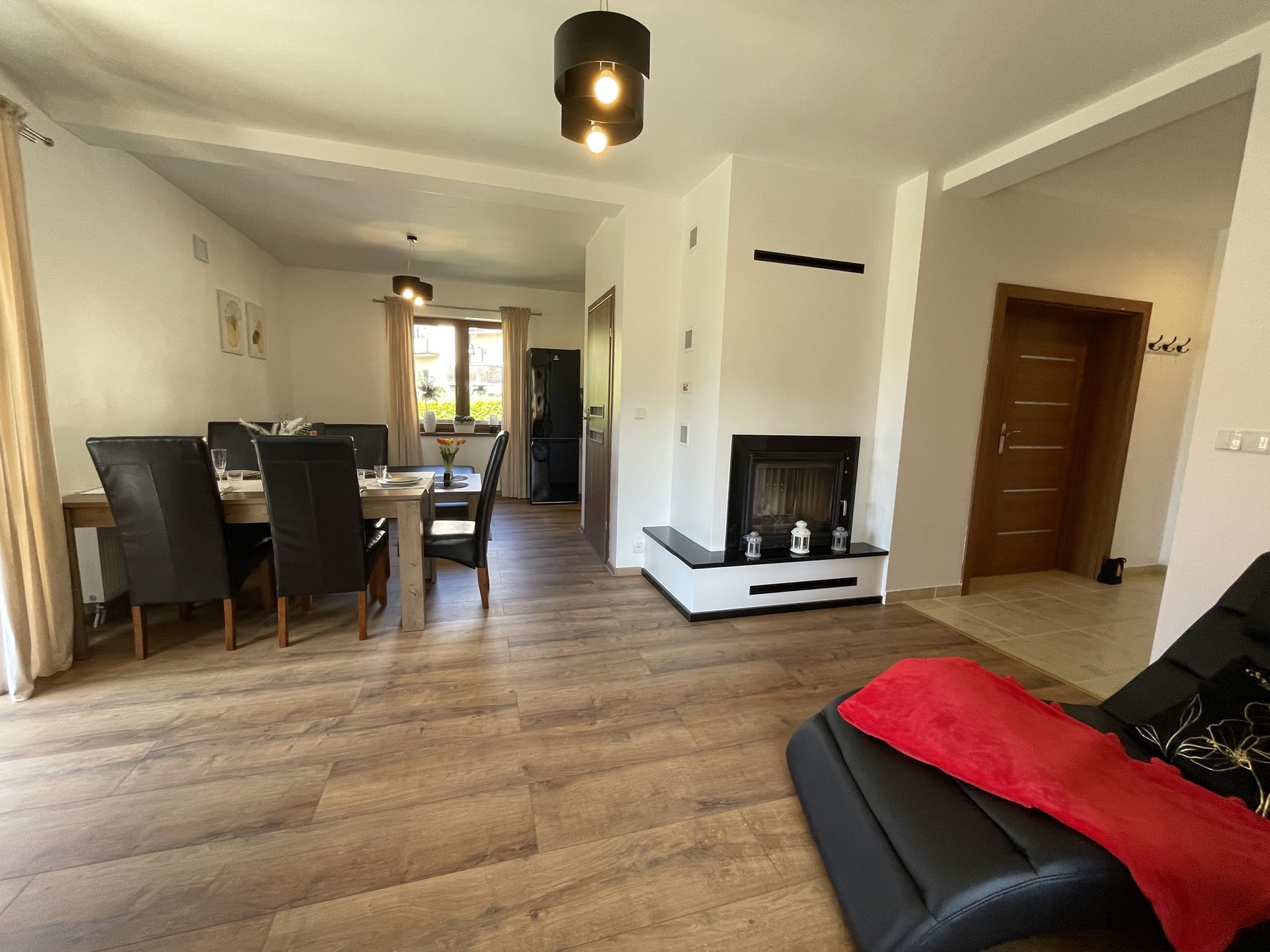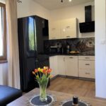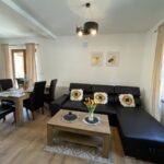 Apartament Kominkowy przeznaczony jest dla max. 5 osób i jest urządzony z myślą o gościach wymagających. Salon wyposażony jest w dużą luksusową skórzaną i rozkładaną kanapę z ławą kawową oraz wygodnym szezlongiem, a także 42-calowym TV i kinem domowym. Salon połączony jest z w pełni wyposażoną kuchnią (zmywarka, lodówka, płyta indukcyjna, mikrofala, ekspres do kawy, czajnik elektryczny, komplet garnków, patelni, naczyń, zastawa stołowa, przybory kuchenne), w której jest duży stół ze skórzanymi, wygodnymi krzesłami, idealny do wspólnego biesiadowania. Dużym atutem apartamentu jest kominek, który pozwoli na odrobinę relaksu z lampką grzanego wina w zimowe wieczory.