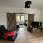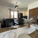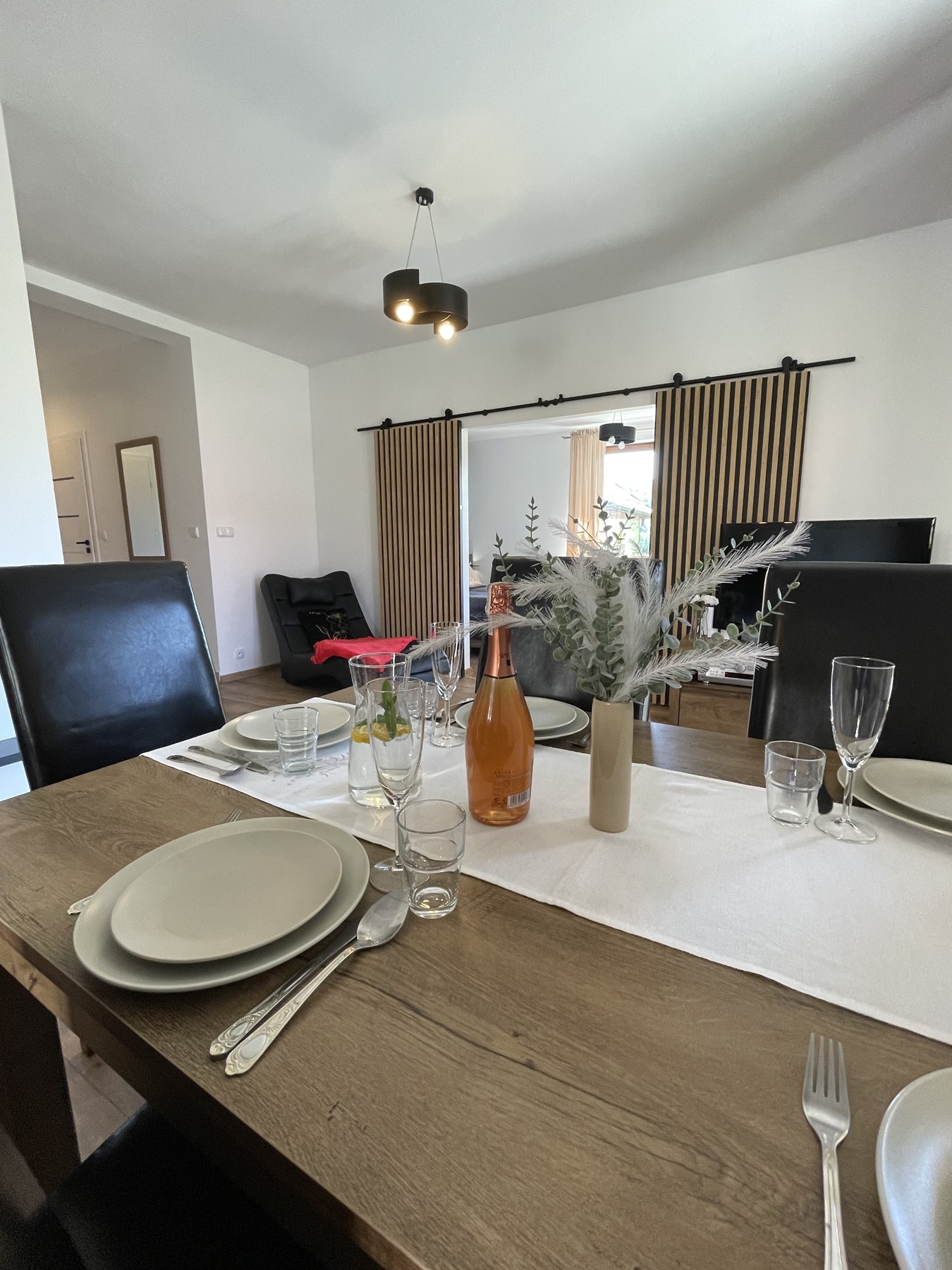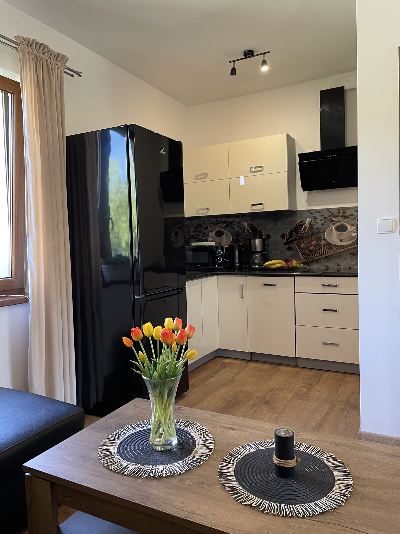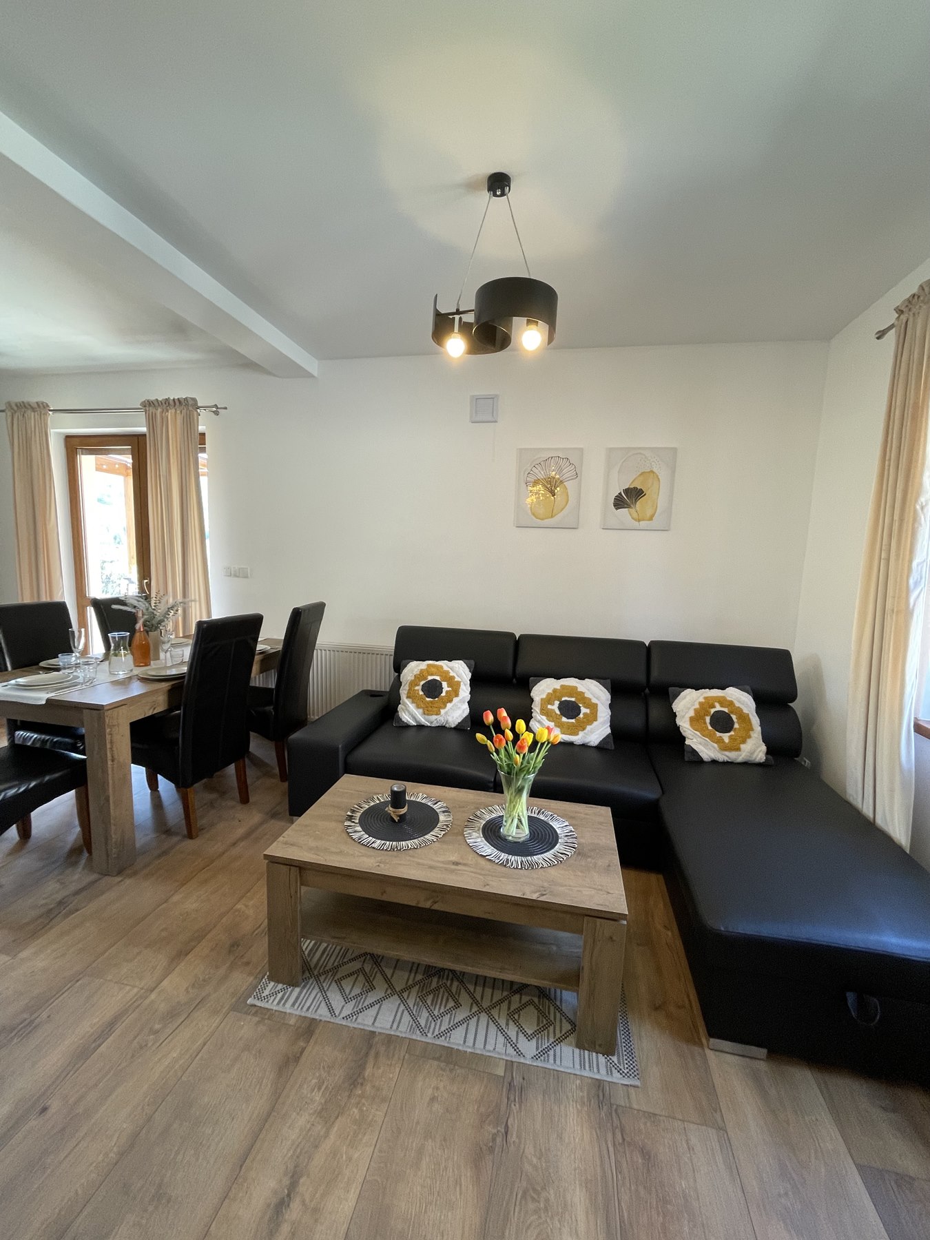 Apartament Kominkowy przeznaczony jest dla max. 5 osób i jest urządzony z myślą o gościach wymagających. Salon wyposażony jest w dużą luksusową skórzaną i rozkładaną kanapę z ławą kawową oraz wygodnym szezlongiem, a także 42-calowym TV i kinem domowym. Salon połączony jest z w pełni wyposażoną kuchnią (zmywarka, lodówka, płyta indukcyjna, mikrofala, ekspres do kawy, czajnik elektryczny, komplet garnków, patelni, naczyń, zastawa stołowa, przybory kuchenne), w której jest duży stół ze skórzanymi, wygodnymi krzesłami, idealny do wspólnego biesiadowania. Dużym atutem apartamentu jest kominek, który pozwoli na odrobinę relaksu z lampką grzanego wina w zimowe wieczory.