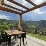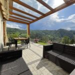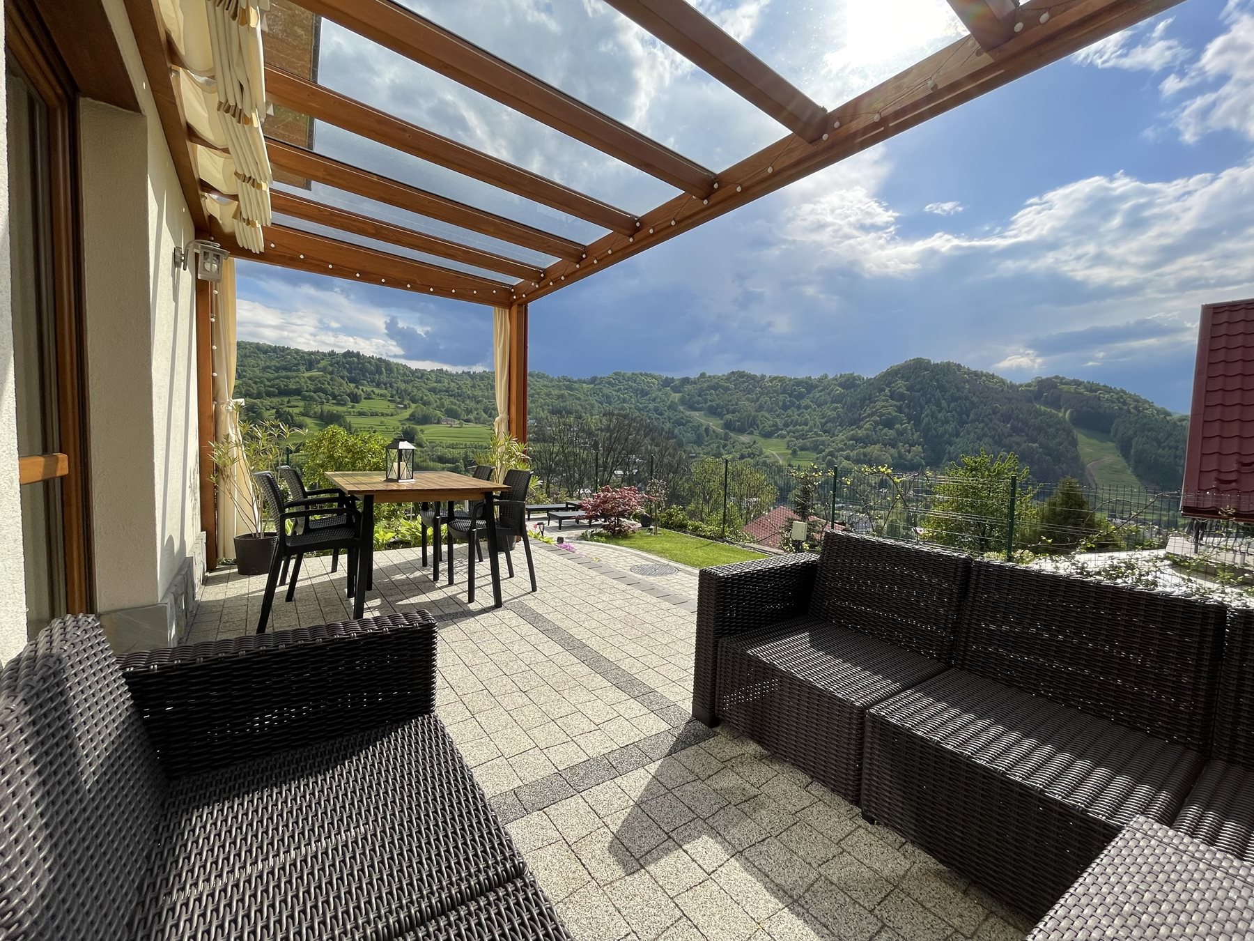 Apartament posiada duży naziemny taras z przeszklonym dachem z bezpośrednim wyjściem do ogrodu. Wyposażony jest w wygodne kanapy z poduchami ze stoliczkiem kawowym, przy którym można wypić aromatyczną kawkę i odpocząć w zaciszu spoglądając na góry oraz z dużym stołem i krzesłami, przy którym na świeżym powietrzu można zjeść śniadanie czy wspólnie pobiesiadować napawając się przepięknymi górskimi widokami.
