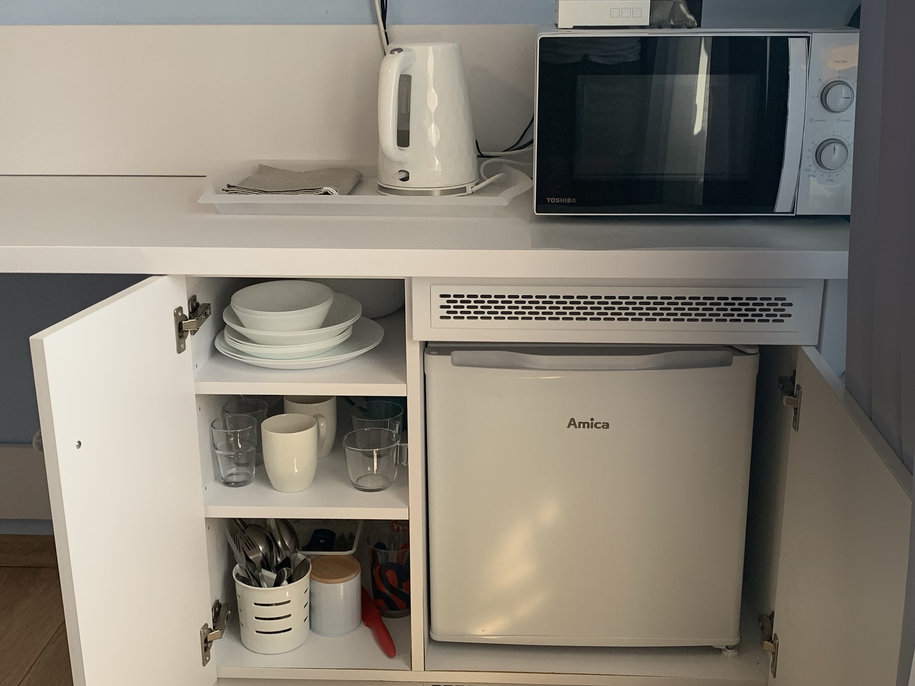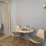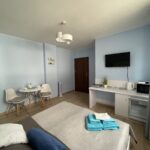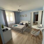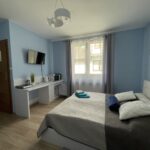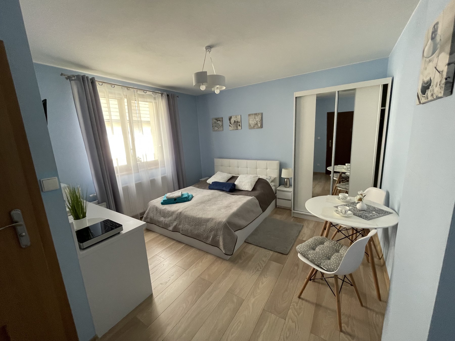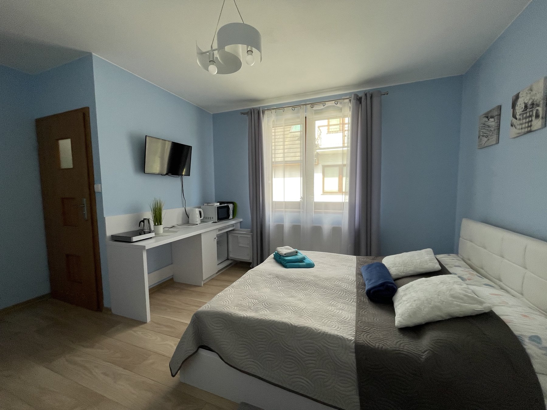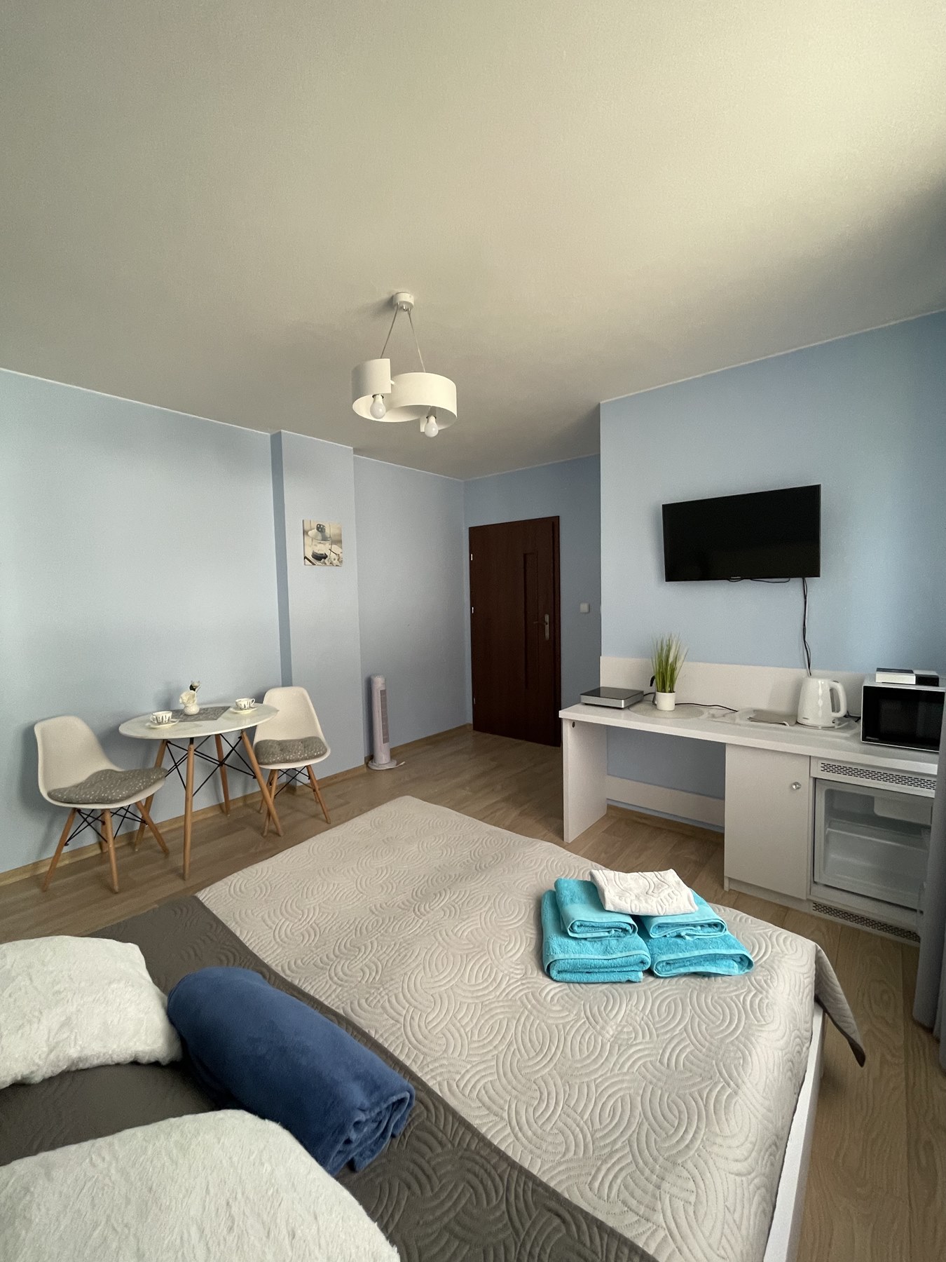 Przestronny pokój przeznaczony jest dla 2 osób, a urządzony jest z myślą o naszych Gościach, którzy kochają nowoczesny styl. W pokoju znajduje się wygodne dwuosobowe łoże z wysokim skórzanym zagłówkiem, dzięki któremu czytanie książek jest jeszcze większą przyjemnością, szafką nocną, dużą szafą oraz stolikiem i dwoma krzesełkami, przy którym można zjeść śniadanie. W pokoju znajduje się również mała lodówka, kuchenka indukcyjna oraz mikrofalowa, czajnik elektryczny, talerzyki, sztućce oraz kubeczki na pyszną kawkę lub aromatyczną herbatę. Łazienka wyposażona jest w prysznic.
