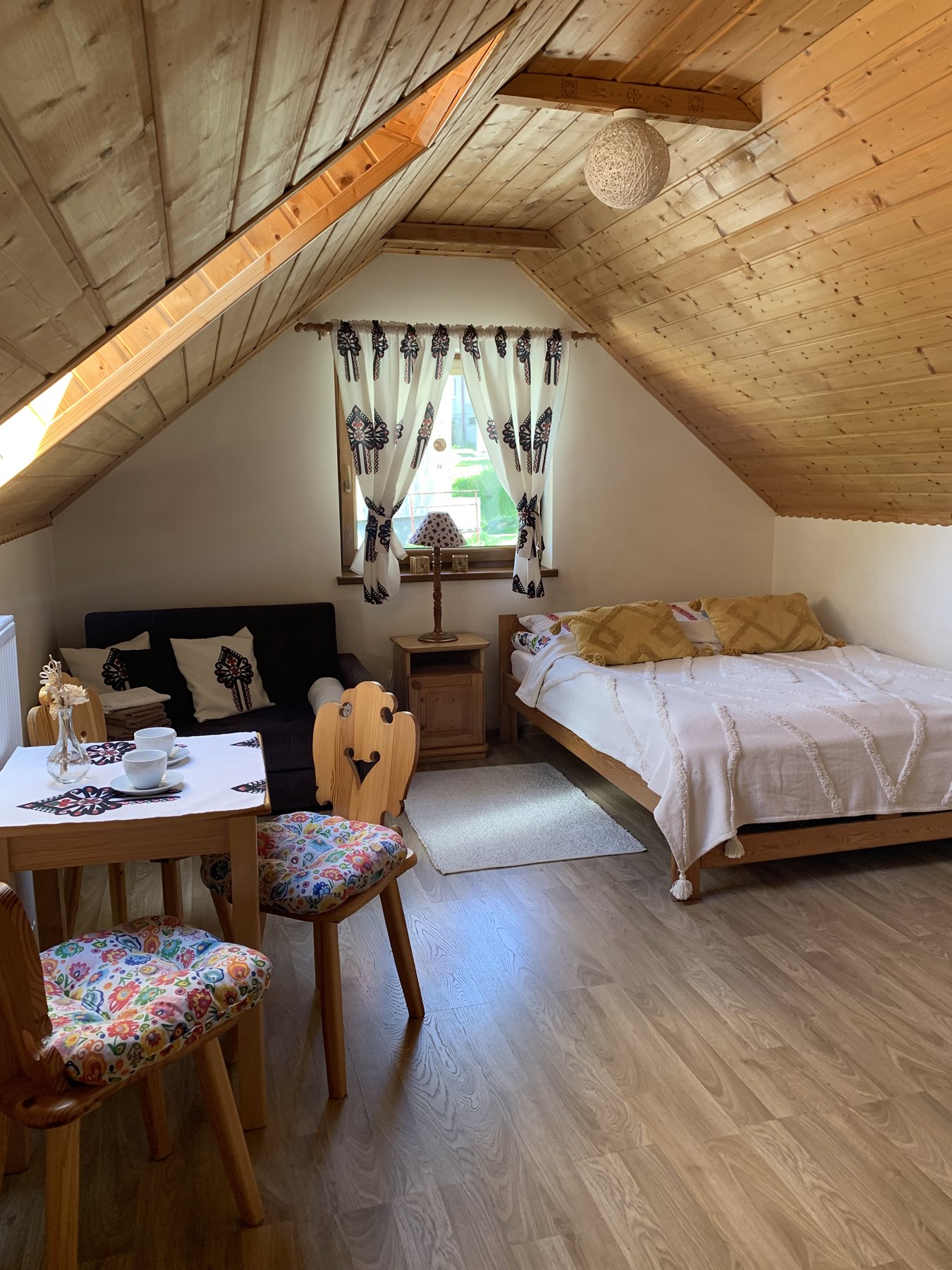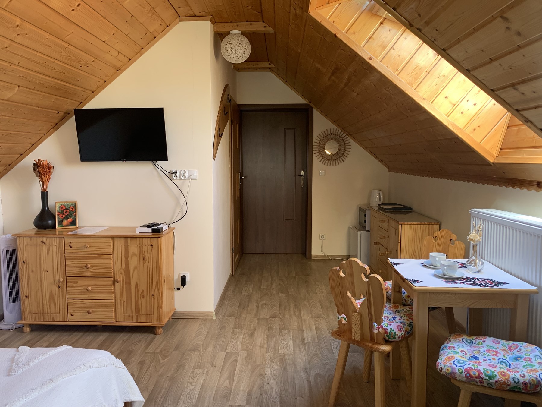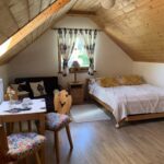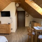 Pokój Górskie Klimaty, idealny dla 2 – 3 osób, utrzymany jest w góralskim stylu. W przestronnym pokoju urządzonym z dbałością o każdy szczegół znajdziecie Państwo duże drewniane łoże dla dwóch osób (160×200), rozkładaną kanapę, na której można odpocząć po pieszych wędrówkach oglądając coś relaksującego w TV, dwóch drewnianych komód oraz stół z dwoma góralskimi krzesełkami, przy którym można wspólnie zjeść posiłek. W pokoju znajduje się również mała lodówka, kuchenka mikrofalowa, czajnik elektryczny, talerzyki, sztućce oraz kubeczki na pyszną kawkę lub aromatyczną herbatę. Łazienka wyposażona jest w prysznic.